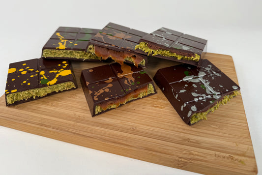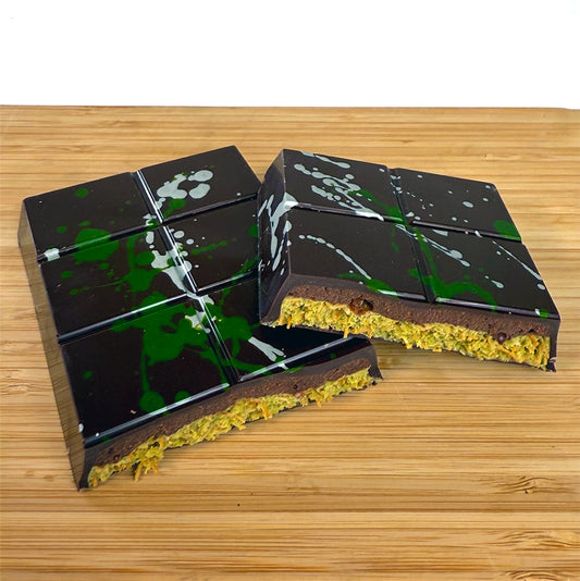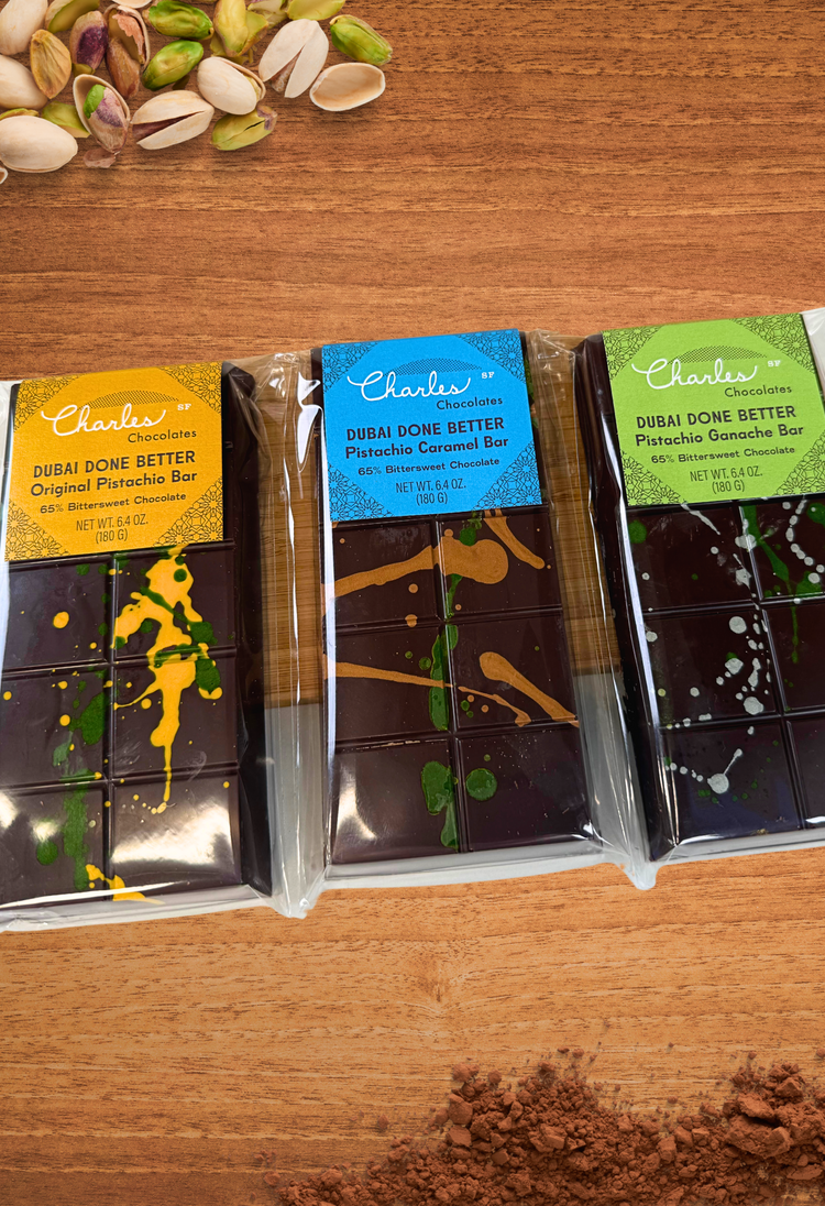 Instead of sweet milk chocolate, we use a rich, lucious, bittersweet chocolate blend that truly compliments the pistachio and crisp shredded kataifi filling. And while we are talking about the filling, every version of the Dubai Bar that I have tried uses a pre-made, very sweet pistachio cream. Given that we were both trying to reduce the sweetness and also stick to our “we make everything from scratch” ethos, our pistachio cream is made fresh here in our kitchens from premium fresh pistachio nuts.